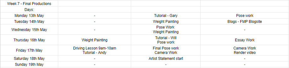 This week was the last week I could work on my practical work. I did manage to get a tutorial with Gary this week though, in which he helped me get my bearings on the weight painting and the posing of my character. Of which I finished the weight painting and moved onto posing the character, which I also completed early on. I then had to get a camera set up in the programme and key frame certain points and angles so that I could produce the rendered video. After this I went ahead and put the video into Adobe Premiere and applied some ambient sounds to it to make it feel better and to add the added level of environment to the character. Once done I also went ahead and made a title and credits for it so that people knew what it was and who had made it. I had also finished off and sent my essay in as part of the deadline.