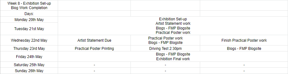 This is the final week where I had to complete both the exhibition set-up for myself and to also complete any and all blog work relating to my FMP. I can say that this week in particular has been pretty stressful as I have had other things that required my attention outside of college work, but I managed to get through it with effort. I feel that my exhibition set-up isn’t bad, as it is a big show reel with everyone else’s work being shown off too. But I do have my own display board that I have put screenshots of my process up on. This I feel will get the audience to appreciate my work more, while viewing both my video and my display board.
